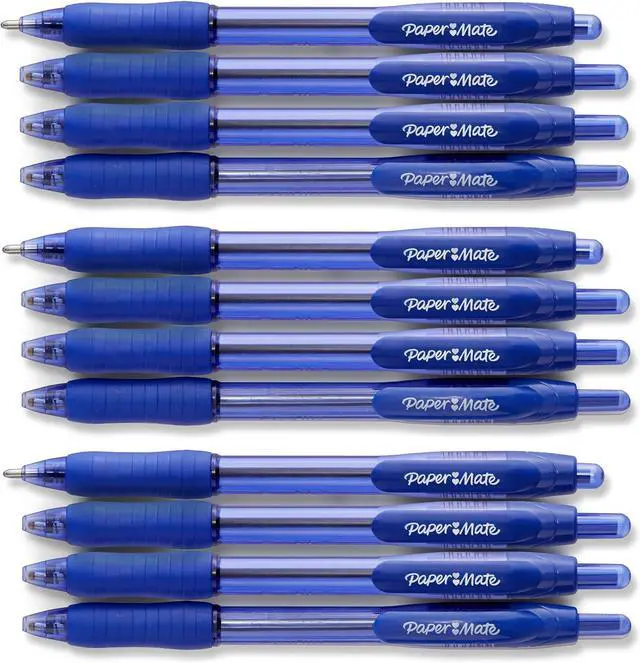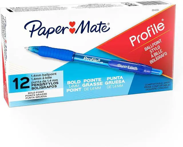 Choose these Paper Mate pens when smooth, comfortable writing is a must. The retractable tip helps keep your pockets, purses and bags protected, so it's easy to carry with you wherever you go. Profile retractable pens unite the smooth feeling of a gel pen with quick-drying, super-bold ink. Click-advance retractable ballpoint pen tip helps protect pockets and purses. Paper Mate pens with an extra-smooth writing system and soft comfort grips provide an easy writing experience. Comes in a pack of 12 blue pens.