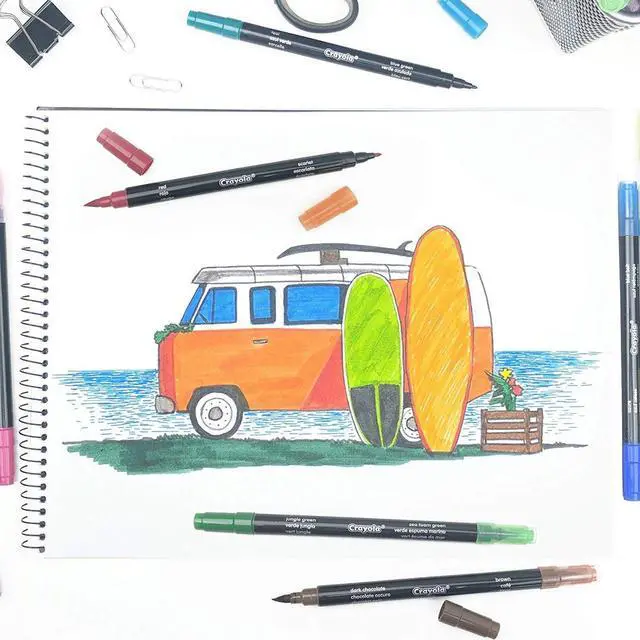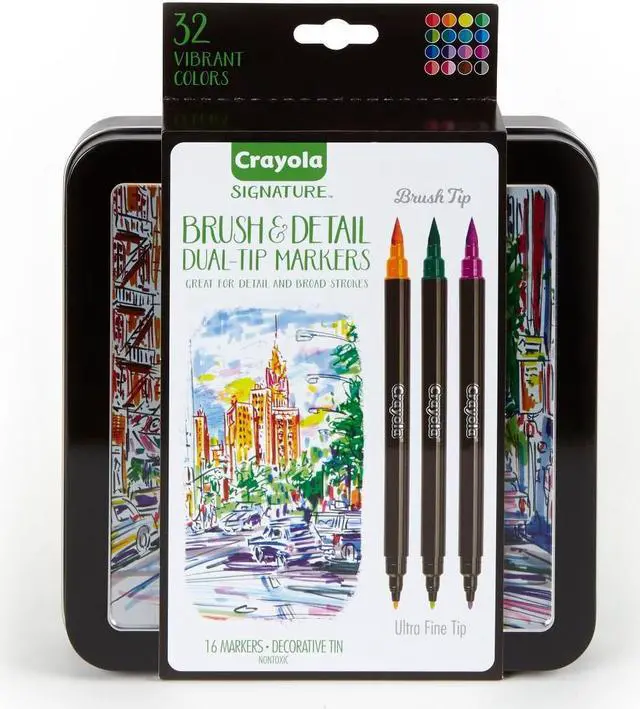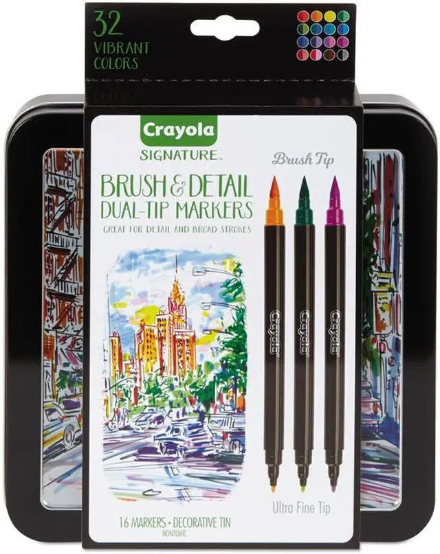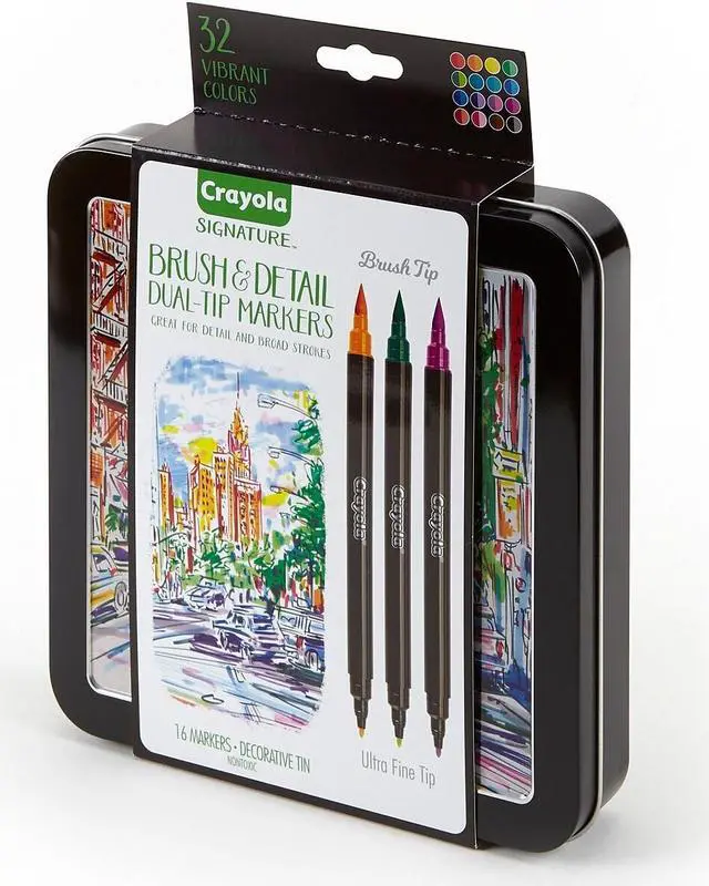Customize your writing, drawing, and coloring with Crayola signature brush and detail dual-tip markers. Each dual-tip marker features a brush tip and an ultra-fine tip and delivers two vibrant complementary colors for twice the versatility and double the coloring fun. Perfect for artists of any age, the dual-ended markers come in a decorative tin that helps ensure they stay in pristine condition between uses. Sketch, write, draw, and blend colors with the versatile Crayola signature brush and detail dual-tip markers. Makes a great creative holiday or birthday gift for crafters. Marker Ink Type: Washable; Marker Tip Type: Brush/Bullet; Marker Tip Size (text): Extra-Fine; Marker Color(s): Assorted.