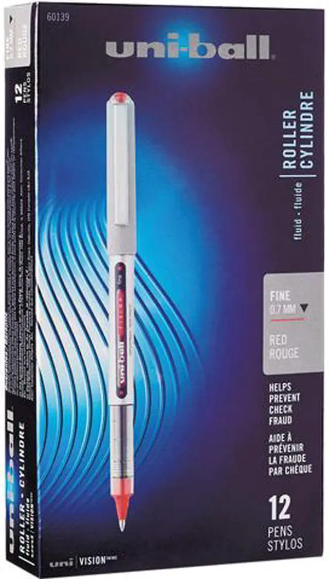 Protect checks and documents against fraud and other unauthorized alterations by using these fine-point rollerball pens with uni Super Ink formula. Featuring vivid red ink, these pens are ideal for making corrections, writing important memos and drawing attention to other notes. These uni-ball Vision red rollerball pens have 0.7mm fine-point tips, producing crisp, precise lines every time you write.