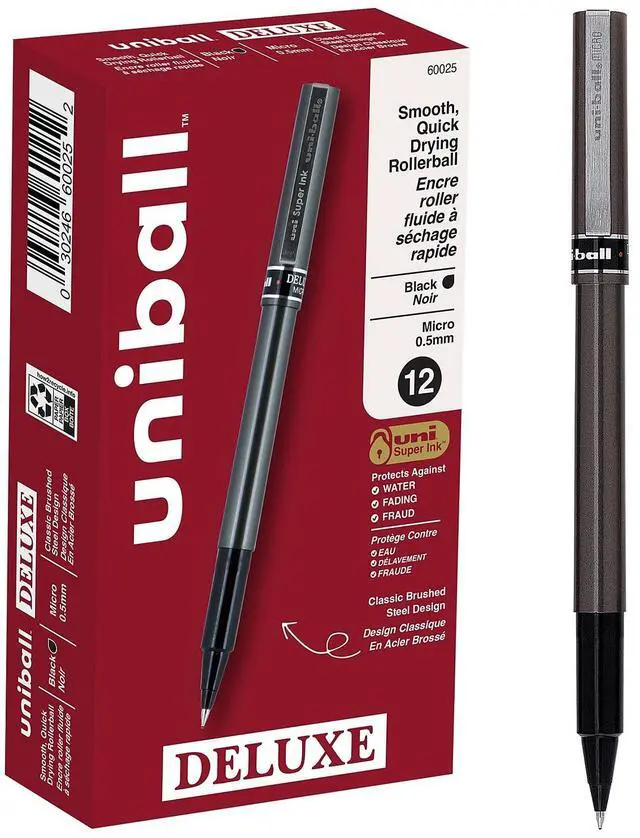 Write with control and accuracy by using this 12-pack of uni-ball Deluxe micro point black rollerball pens.