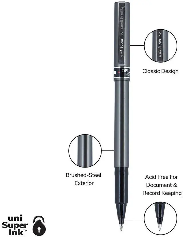 Draw tiny details, create labels and work on other writing projects with these micro point rollerball pens. With a specialized design, these pens ensure ink fuses onto pages for protection against document alterations, check washing and similar activity. These uni-ball Deluxe black pens have brushed steel body for a professional appearance, while the water-resistant and fade-resistant ink preserves writing, so you can refer back to past papers easily.