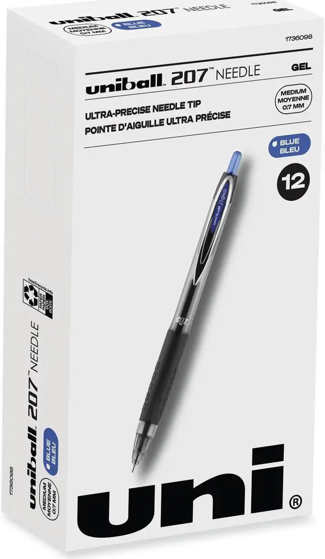 Stock your office, home or classroom with 207 Needle Retractable Gel Pens from uniball featuring a 0.7mm medium point. These needle point pens are designed with a bend resistant tip for better accuracy. Even-flowing, pigment-based gel ink delivers a smooth writing experience for intense, vibrant lines, ensuring that every mark is brilliantly communicated. Use these retractable gel pens for everyday writing tasks, check signing and all of your important signatures, trusting its quick-drying uni Super Ink. Innovative uni Super Ink technology effectively entraps the gel ink into the paper, producing fraud, fade and water-resistant documents that resist check washing or bleaching. The 0.7mm medium needle point allows you to create ultra-precise, straight edge lines with ease. A textured grip offers greater comfort and control as you continue writing, while a translucent ink window indicates the level of gel ink remaining, so you don't run out unexpectedly. The sleek design of the 207 with modern metal accents gives the retractable gel pen a stylish touch.