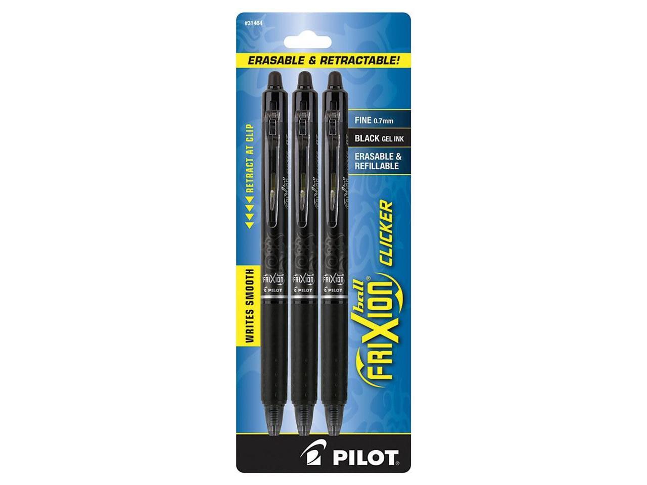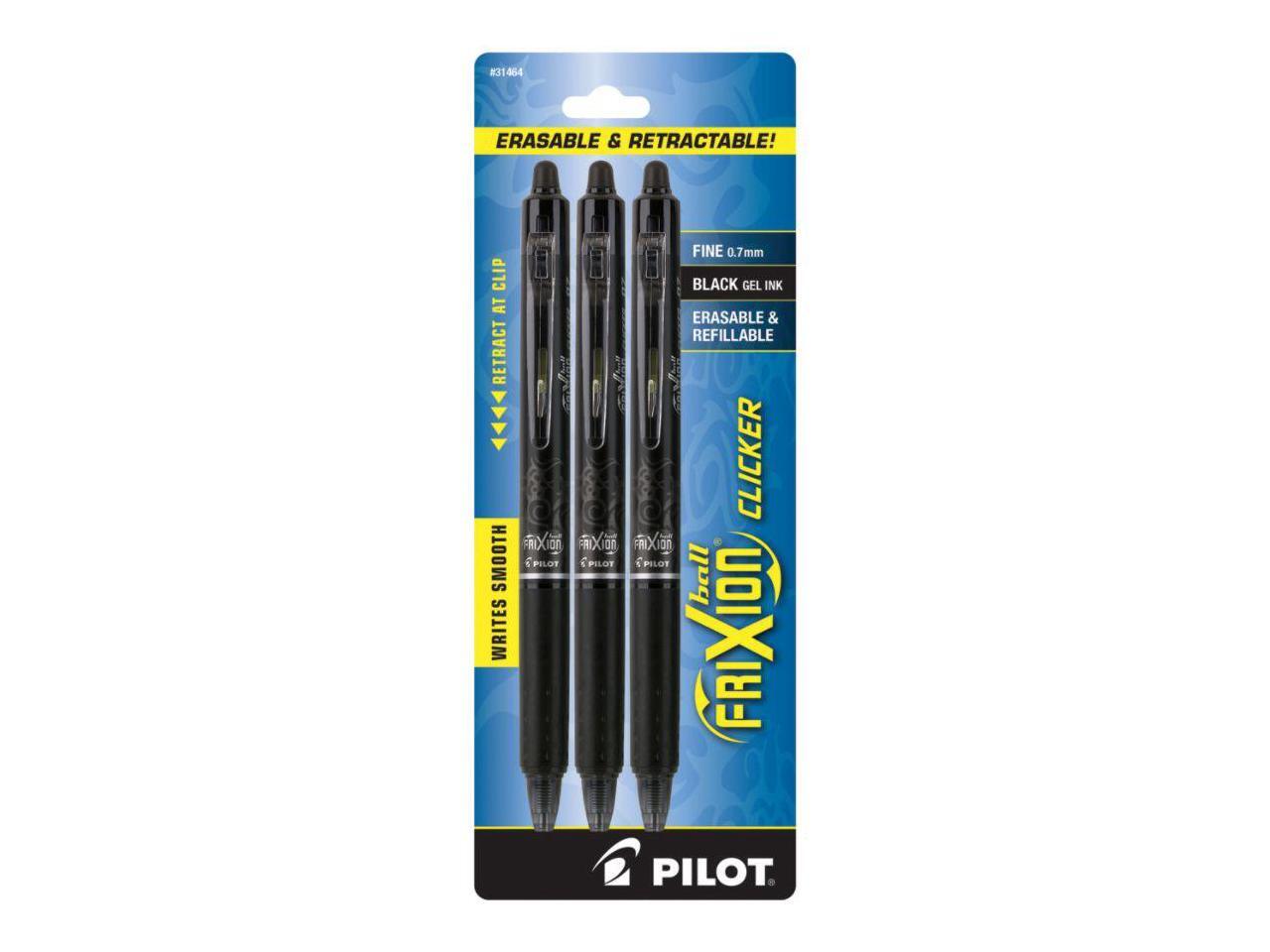 Pilot® FriXion Clicker Erasable Gel Pens, Fine Point, 0.7 mm, Black Barrels, Black Ink, Pack Of 3