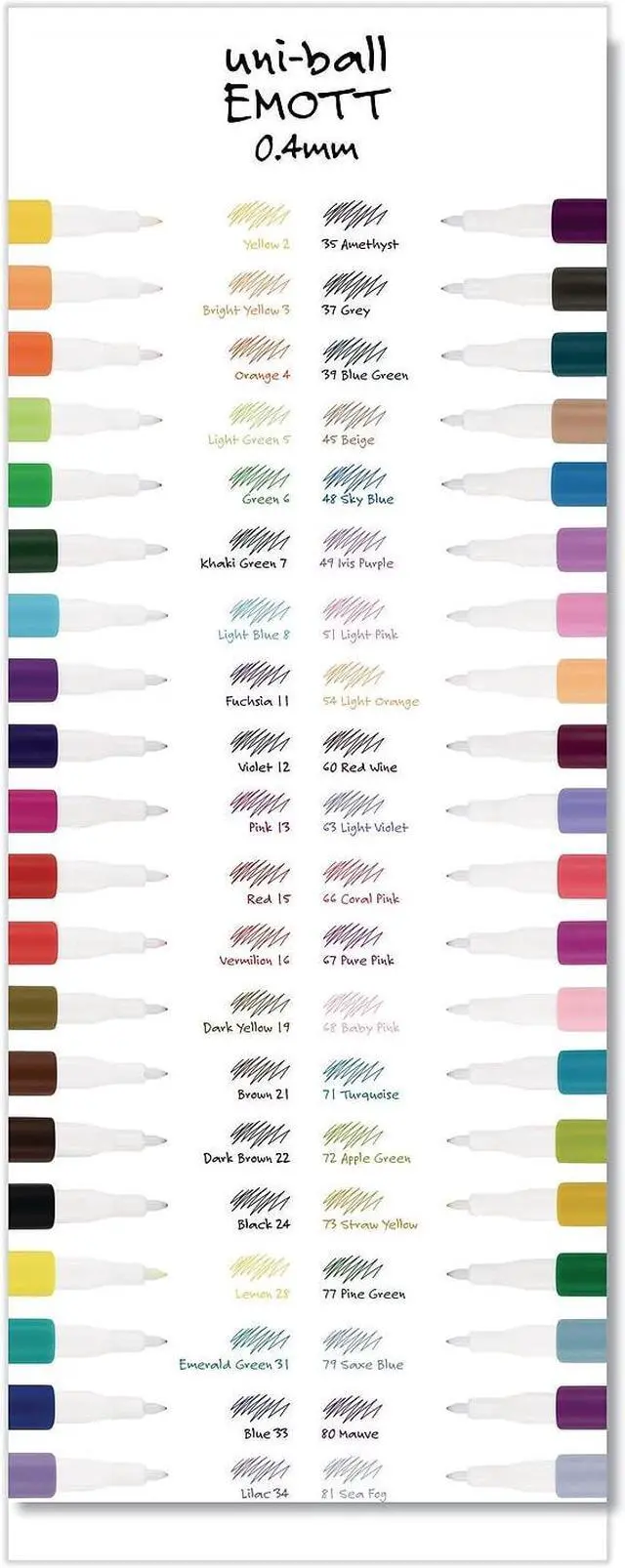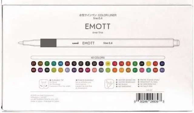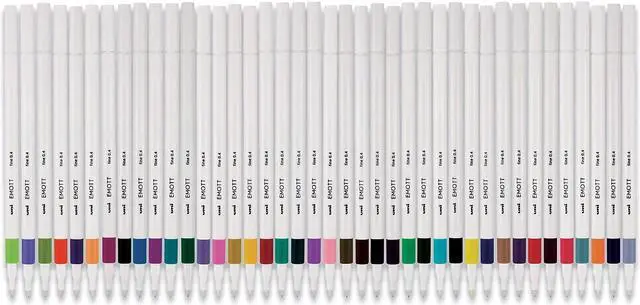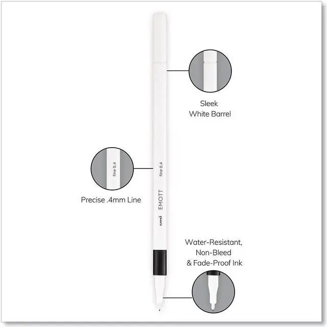 Watch your writings and drawings come to life with EMOTT Fineliner Marker Pens from uni-ball. The ultra precise 0.4 mm durable tip is designed with a protective core that prevents bending or splitting, ensuring consistent lines at any angle or pressure. Designed with a sleek, square barrel, the pen is comfortable to use and won't roll away when you put it down. Micro fineliner markers deliver crisp lines with unparalleled definition, useful for adding a colorful flair to your fun writing projects or creating intricate drawings. Newly developed pigmented ink is water-resistant, fade-proof and will not smear. It does not bleed and provides excellent long lasting color coverage. Meticulously designed for durability and smooth writing.