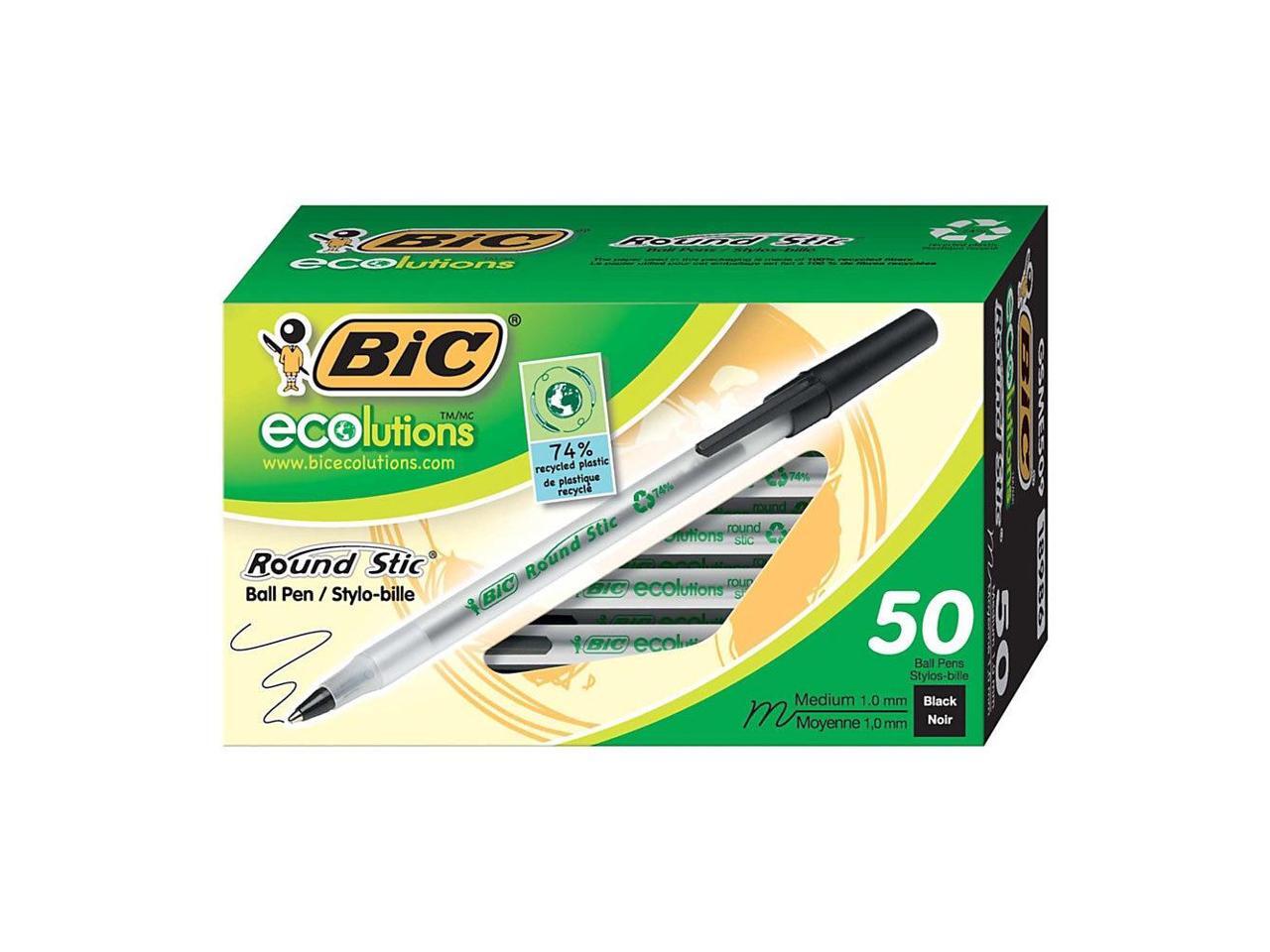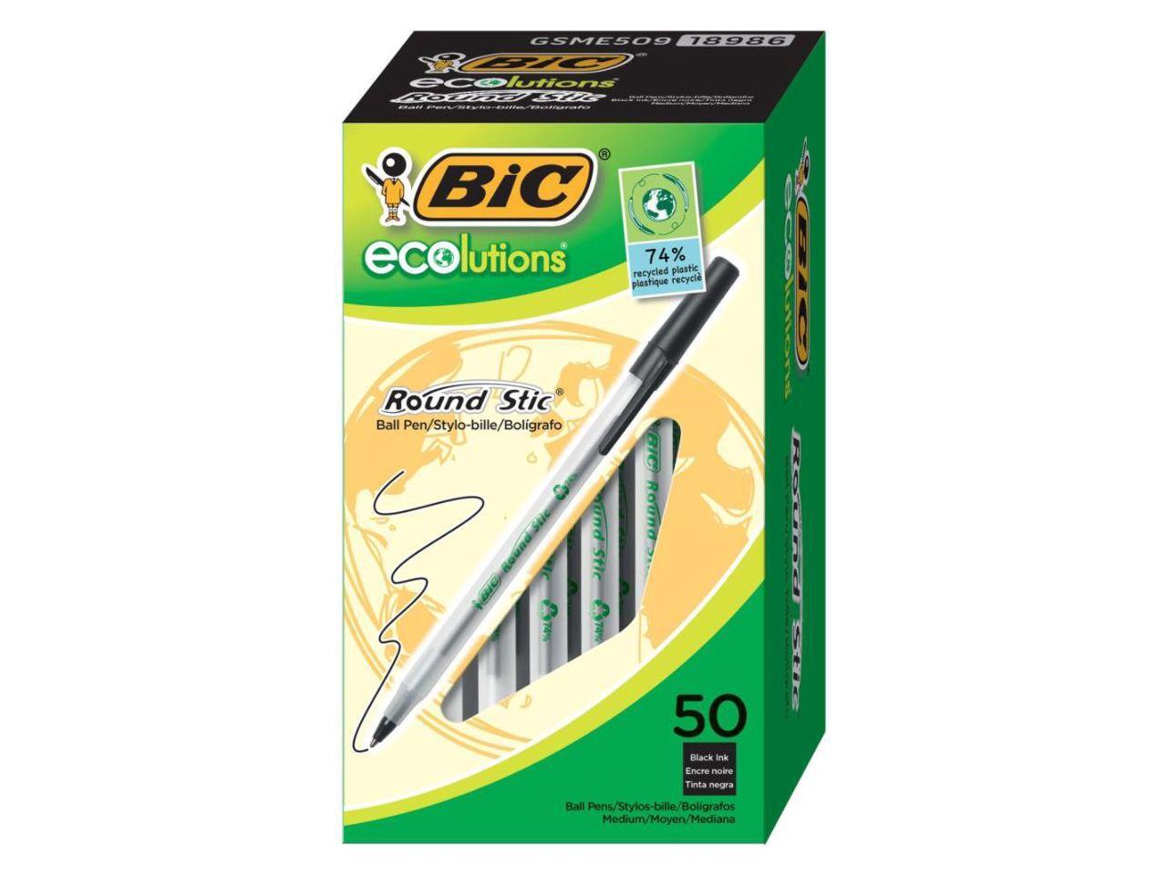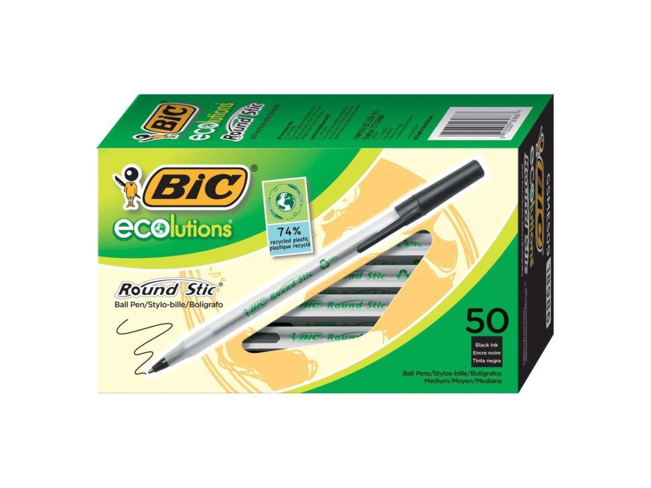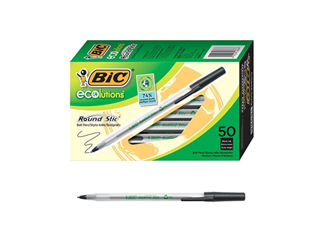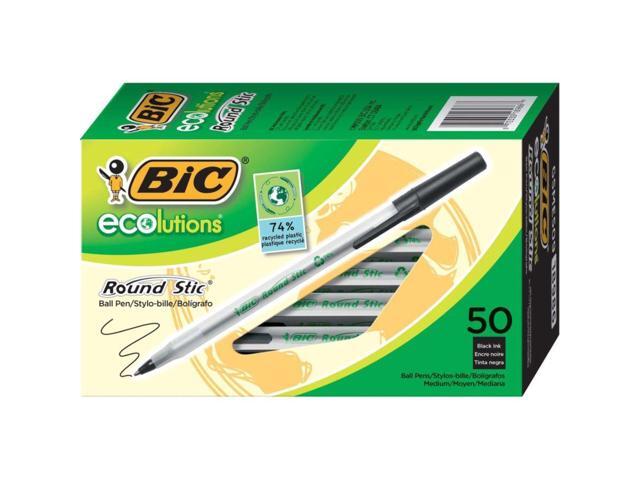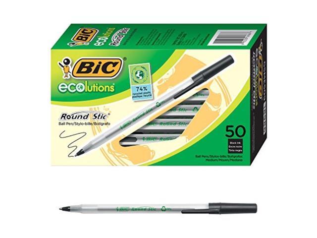- One package contains 50 BIC Ecolutions Round Stic Black Ballpoint Pens. The classic, slender, semi-clear barrel makes it easy to check pen ink levels and makes the pen generally comfortable to hold; the pen is also suitable for lefties and righties, as the ink pen dries quickly to prevent smearing.