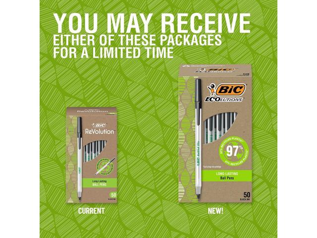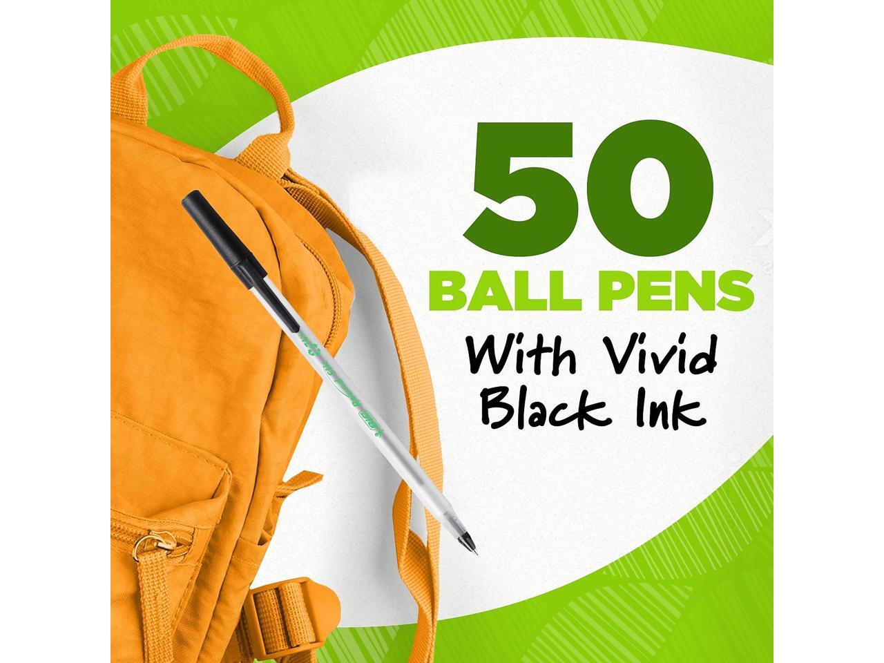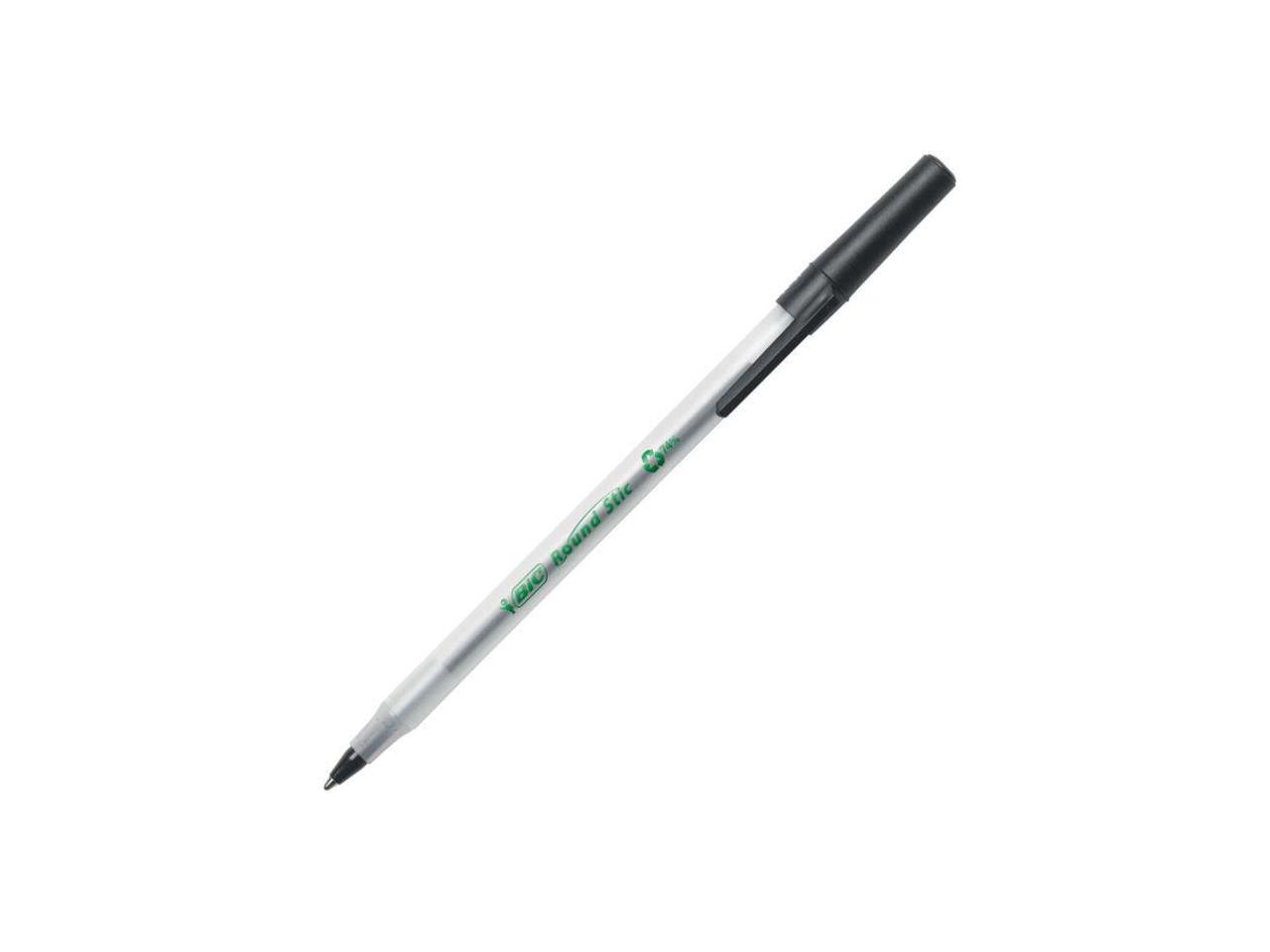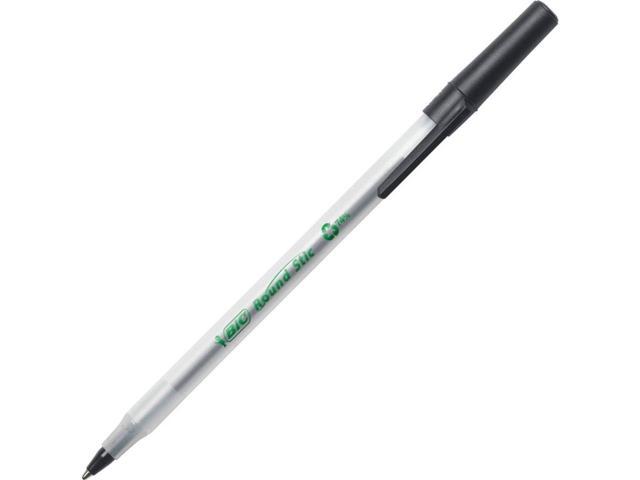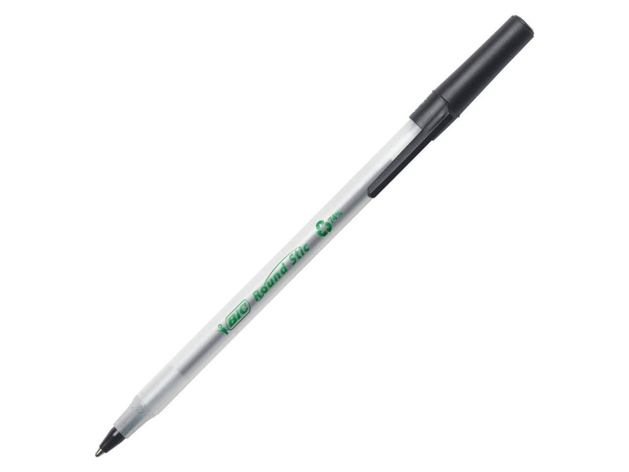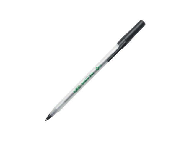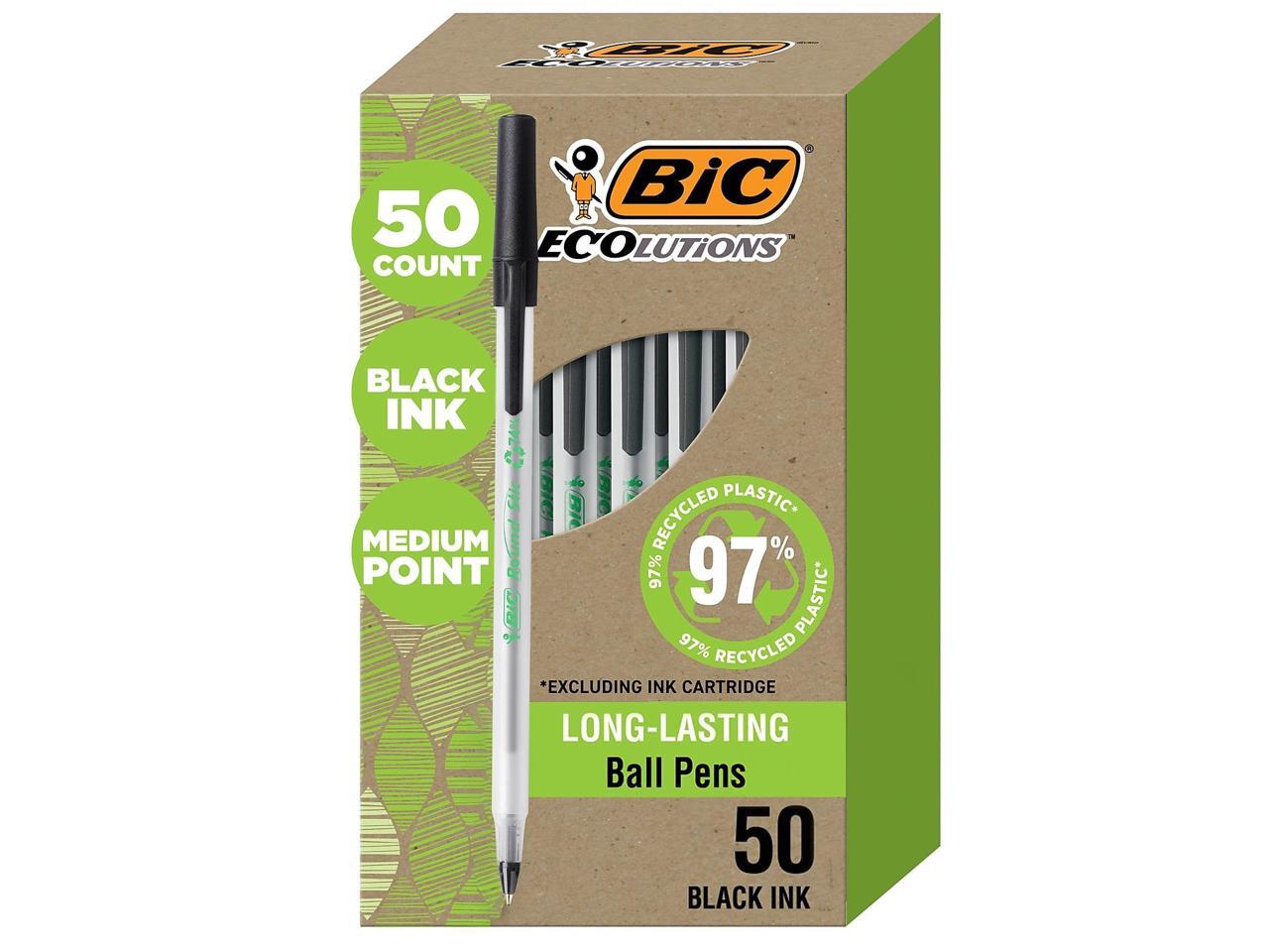 - One package contains 50 BIC Ecolutions Round Stic Black Ballpoint Pens. The classic, slender, semi-clear barrel makes it easy to check pen ink levels and makes the pen generally comfortable to hold; the pen is also suitable for lefties and righties, as the ink pen dries quickly to prevent smearing.