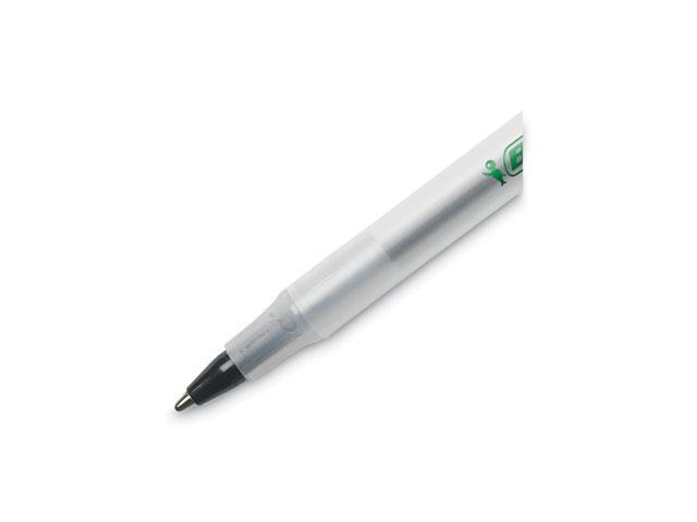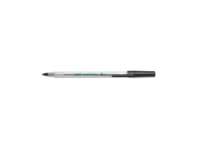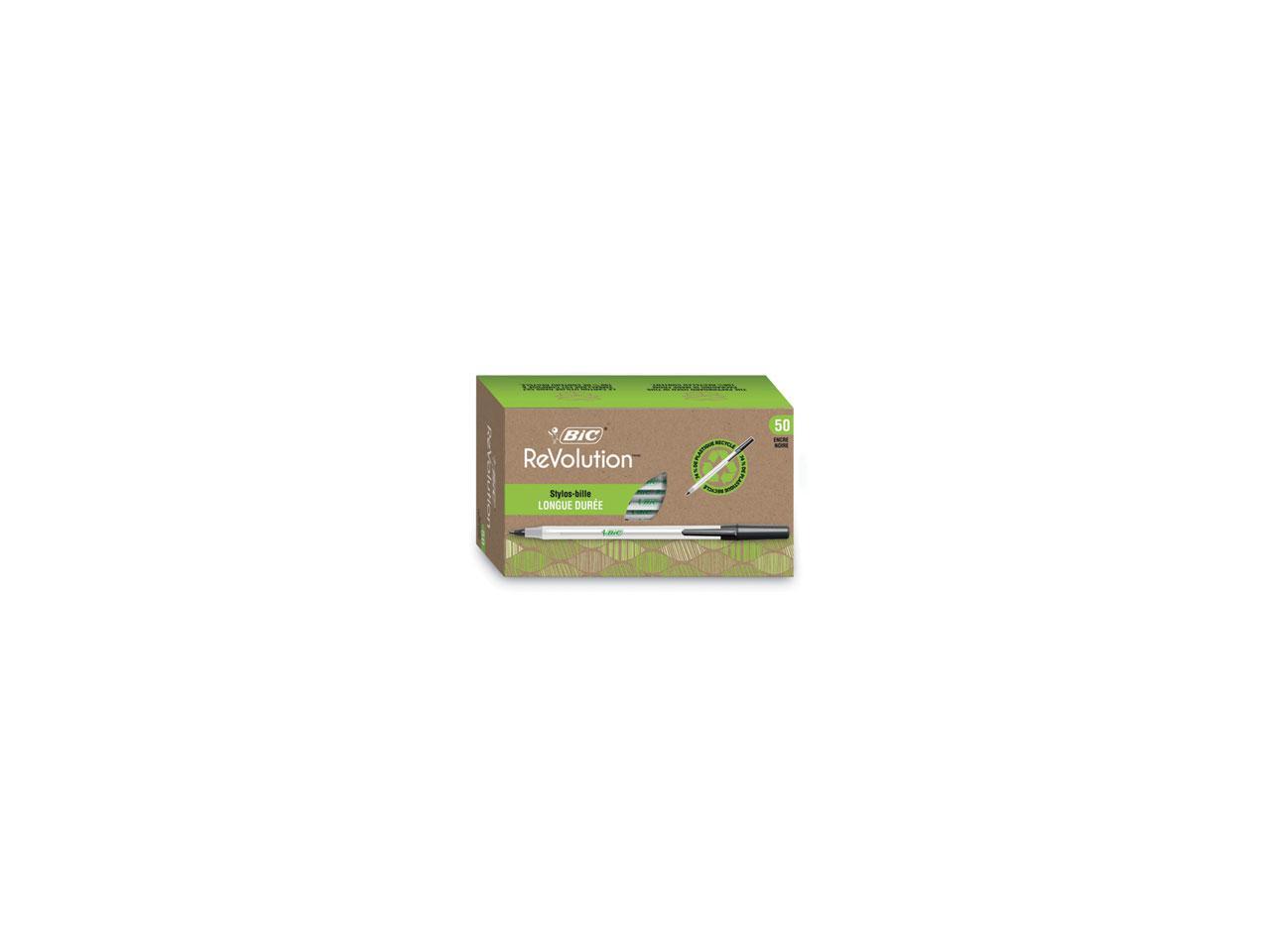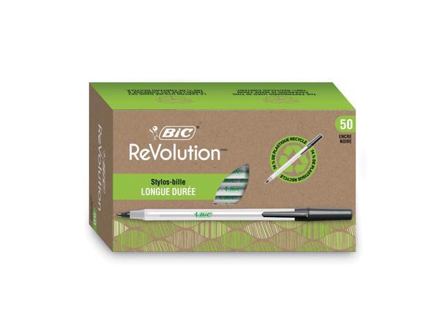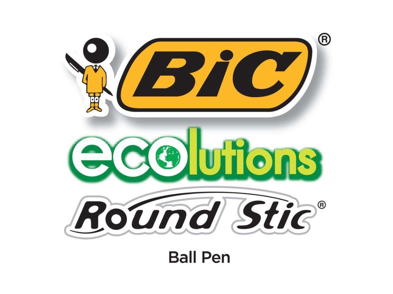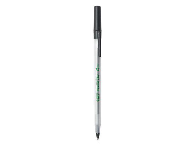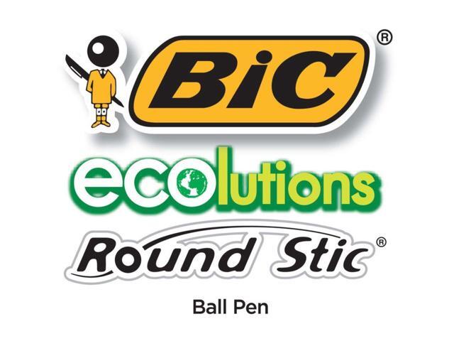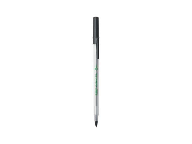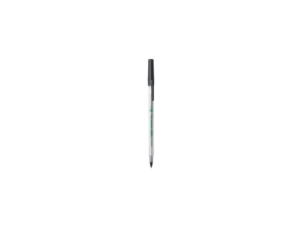 - One package contains 50 BIC Ecolutions Round Stic Black Ballpoint Pens. The classic, slender, semi-clear barrel makes it easy to check pen ink levels and makes the pen generally comfortable to hold; the pen is also suitable for lefties and righties, as the ink pen dries quickly to prevent smearing.