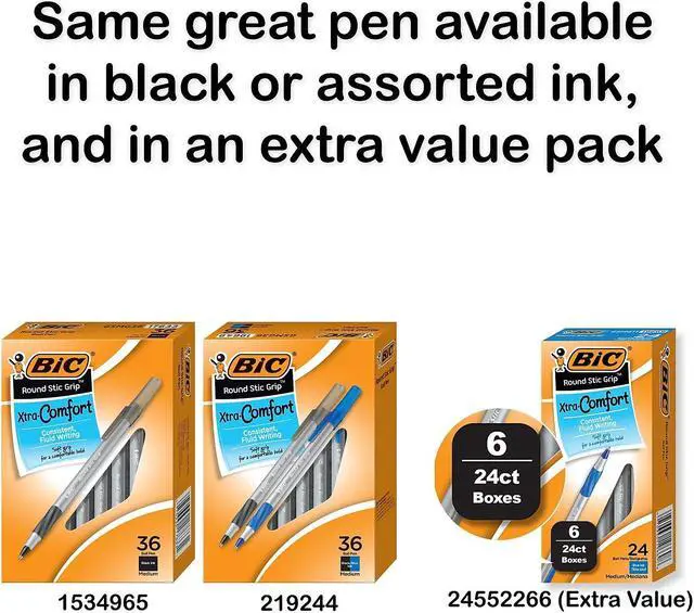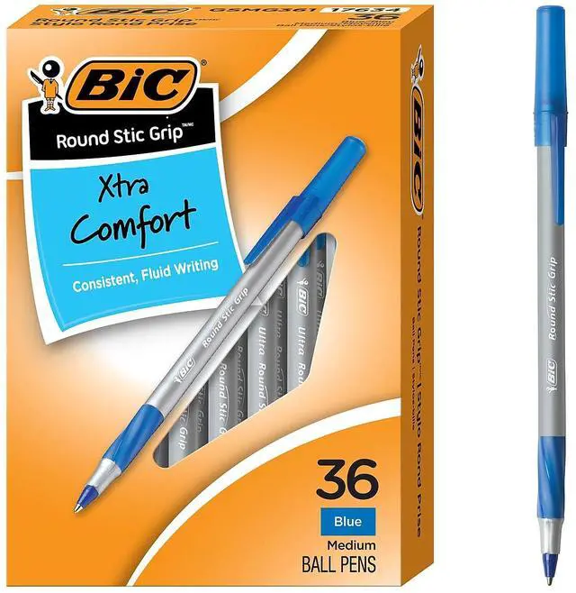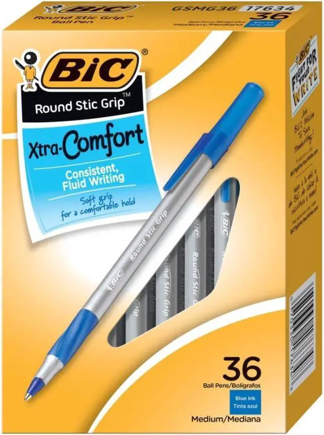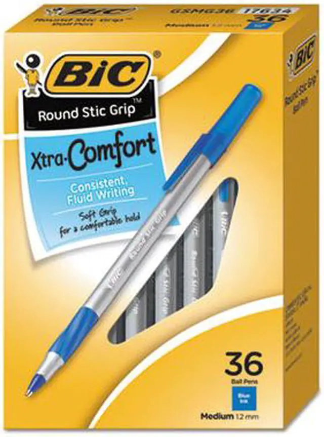 These 1.2mm medium point pens are great for everyday writing at work, school or home and have Easy-Glide System Ink that writes fluidly and effortlessly. Creating clear, vivid lines, theyre the ideal blue pens for writing lists, taking notes, journaling and more. The classic round barrel fits snugly in your hand and the soft grip provides a firm yet comfortable hold, making these ballpoint pens ideal for prolonged writing sessions. With the proprietary Easy-Glide System Ink, these blue ink pens provide consistent ink flow and offer up to 50 percent smoother writing compared to BIC's traditional ballpoint pens. Plus, the plastic clip easily attaches to pockets, notebooks and more for quick access on the go. With this 36-count pack of blue writing pens, you can write clearly and comfortably. Looking for reliable pens for school or office supplies? Choose BIC Round Stic Grip Xtra Comfort Blue Ballpoint Pens for a high-quality and affordable product you can trust.
