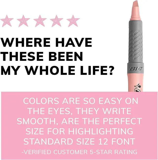 BIC Brite Liner Grip Pocket Highlighters have super-bright fluorescent ink for attention-grabbing highlighting and a textured rubber grip for added comfort. Chisel tip is ideal for both broad highlighting and fine underlining. Wont dry out if the cap is left off for eight hours. Highlighter Style: Pen; Highlighter Ink Color: Assorted; Color Family: Multicolor; Highlighter Ink Color Assortment: Pastel Blue; Pastel Green; Pastel Orange; Pastel Pink; Pastel Purple; Pastel Yellow.
