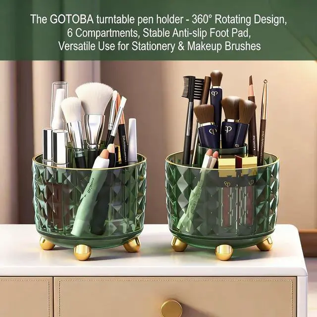 The GOTOBA green pencil holder for desk is a versatile and compact desk accessory that can efficiently accommodate pens, pencils, and other items such as makeup brushes. It aims to keep your workspace tidy and organized by providing 6 slots for storage.