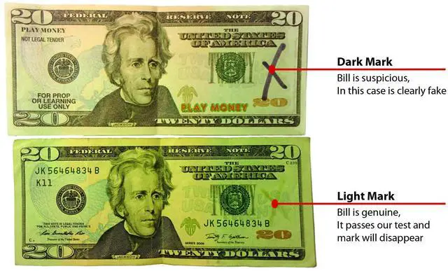 DURABLE ROUND TIP - Professional round bullet tip will not dent or dry out fast. Leaves strong marks on Dollars, Pesos, Euros, Yen - and many other modern paper based currencies.