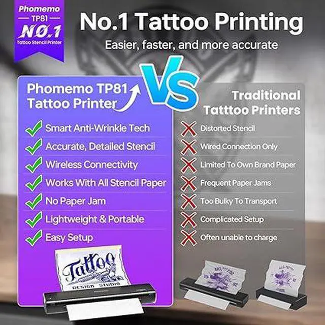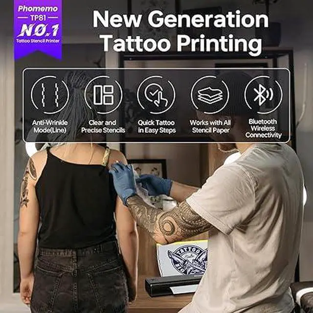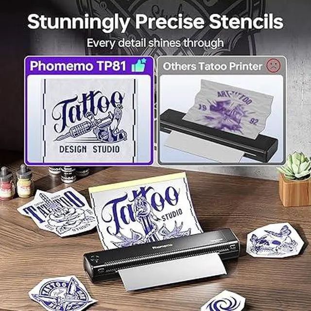 Phomemo TP81 Redefining Tattoo Trends :Designed specifically for tattoo artists and beginners, Phomemo TP81 is a wireless and lightweight bluetooth tattoo stencil printer with a built-in rechargeable battery. Weighing only 1.6 pounds, it's 50% lighter than traditional machines.