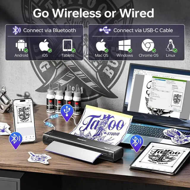 Compatibility with Multi-System: Phomemo TP81 Tattoo Stencil Printer is compatible with a wide range of devices, including smartphones, tablets, laptops, and desktop computers.(Note:Bluetooth Connection Only for Smartphone & Tablets, USB Connection Only for PC & Laptops)