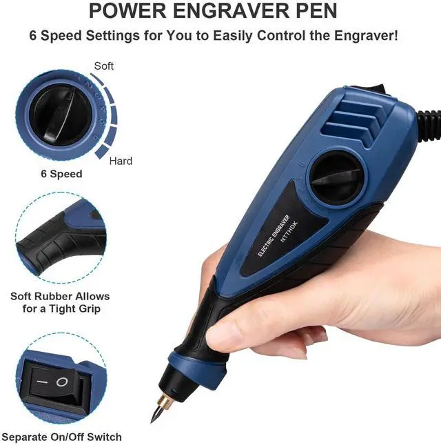 The variable speed engraver can adjust 6 different speed at 7200/min strokes to meet your different needs. Regulate engraving depth from fine lines to deep grooves by 6-position dial.