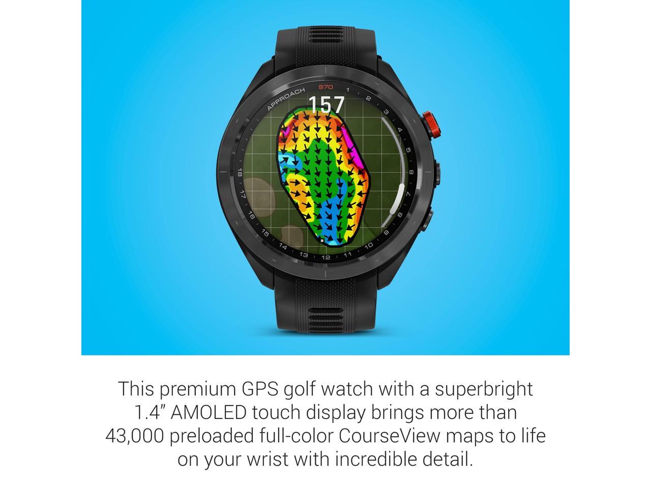 Stunning 1.4 AMOLED display brings more than 43,000 preloaded full-color CourseView maps to life on your wrist. Look good on and off the course with a lightweight, stylish design and ceramic bezel. Battery life: up to 16 days of battery life in smartwatch mode and up to 20 hours in GPS mode. Enhanced golf course maps allow you to see intricate details with the ability to pan and zoom for narrowing in on your target distance. Improved virtual caddie feature shows your shot dispersion data and suggests a club based on a variety of factors, including your historical swing data, elevation, wind speed, wind direction and more