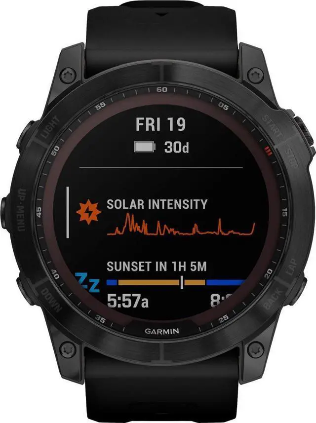 Long-running solar powered multisport GPS watch with scratch-resistant Power Sapphire lens and always-on 1.4 display uses the suns energy to extend battery life; a built-in LED flashlight keeps you going after dark