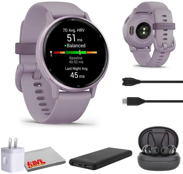With over 30 preloaded GPS and indoor sports appsincluding walking, running, cycling, pool swimming, and moreit tracks all your activities seamlessly. Free Garmin Coach training plans, the ability to create custom workouts, and detailed tracking for strength, HIIT, cardio, elliptical training, stair stepping, floor climbing, indoor rowing, Pilates, and yoga make it a complete fitness companion. Smart features like music streaming, contactless payments, and safety tracking (including live location sharing in case of incidents) add to its versatility. The 6Ave Garmin Watch Bundle includes the Garmin Vivoactive 5 with a Metallic Orchid bezel, Orchid case and band, a microfiber cleaning cloth, P-Bank battery, USB adapter, and Air Pro TWS truly wireless earbuds (color may vary).