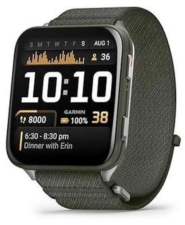 Sleek GPS smartwatch with our biggest display - 2 easy-to-read AMOLED - and our thinnest watch case measuring 8 mm with a scratch-resistant sapphire lens, titanium caseback, bright LED flashlight and ComfortFit nylon band for all-day wearability. Battery performance: up to 8 days in smartwatch mode; up to 16 hours in GPS mode. Health is wealth; invest in yours with 24/7 health and wellness monitoring with HRV status, advanced sleep tracking, Body Battery energy monitoring, Pulse Ox and more (this is not a medical device, and data presented is intended to be a close estimation of metrics tracked; Pulse Ox not available in all countries). Track your passions with more than 100 preloaded indoor and outdoor sports apps, including running, golf and strength training. Stay connected hands-free: A built-in speaker and mic let you make and take phone calls from your wrist when your watch is paired to your smartphone - and you can even use your smartphones voice assistant to respond to text