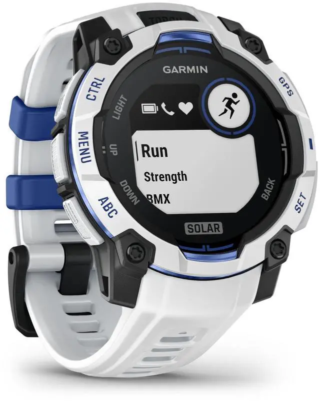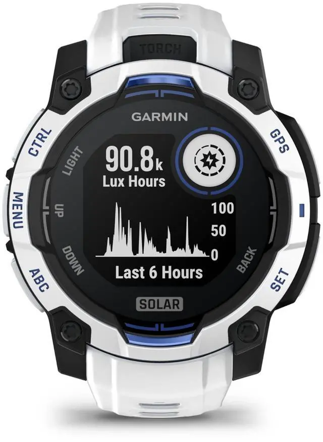 Instinct® 3 is the rugged 45 mm GPS smartwatch with a 0.9 display, built-in flashlight and unlimited battery life in smartwatch mode with solar charging (assumes all-day wear with 3 hours per day outside in 50, 000 lux conditions). With bolted construction, a metal-reinforced bezel and scratch-resistant lens, it can take on your toughest adventures. Its engineered to MIL-STD-810 standards for thermal and shock resistance and is also 10 ATM water-rated. To keep you on track, the Instinct 3 smartwatch includes a built-in 3-axis compass and barometric altimeter. Plus, multi-band GPS with SatIQ technology delivers superior positioning while also optimizing battery life.