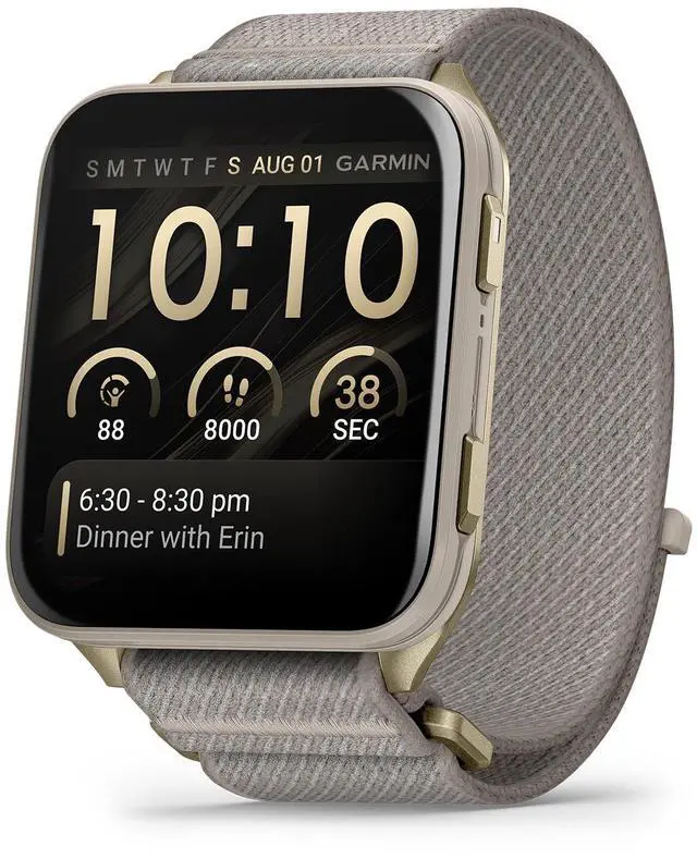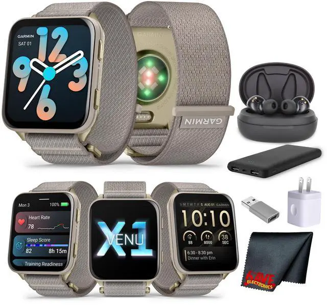 The Garmin Venu X1 GPS smartwatch combines a large, easy-to-read display with a slim, lightweight design built for everyday wear and performance-focused activities. Its 2-inch AMOLED screen offers strong visibility for workouts, navigation, and daily interactions, while the 8mm case profile keeps the watch comfortable throughout long days. A sapphire lens and titanium caseback enhance durability, paired with a breathable ComfortFit nylon band suited for both active and casual use. Battery performance supports consistent daily wear and extended GPS sessions, delivering up to 8 days in smartwatch mode and longer runtime using Battery Saver mode.
