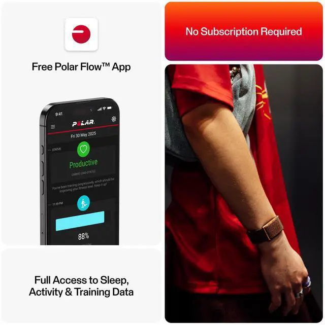 With 24/7 tracking of heart rate, sleep, and daily activity, POLAR Loop delivers meaningful insights to help you enhance your well-being, fitness, and daily performancewithout distractions or data overload. Wear it all day, let it quietly track in the background, and check your progress when it suits you. No screens. No interruptions. No monthly fees.