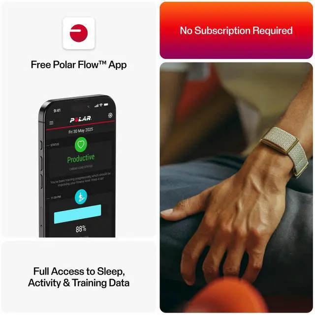 With 24/7 tracking of heart rate, sleep, and daily activity, POLAR Loop delivers meaningful insights to help you enhance your well-being, fitness, and daily performancewithout distractions or data overload. Wear it all day, let it quietly track in the background, and check your progress when it suits you. No screens. No interruptions. No monthly fees.