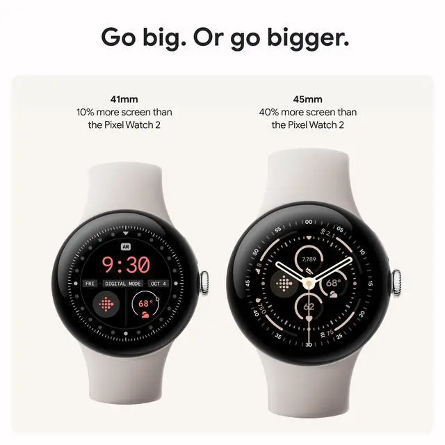 The Google Pixel Watch 3 is designed for performance, with advanced fitness from Fitbit[1, 2]; the 41mm screen is twice as bright and 10% larger than before, making it easier to see your stats and info[1]