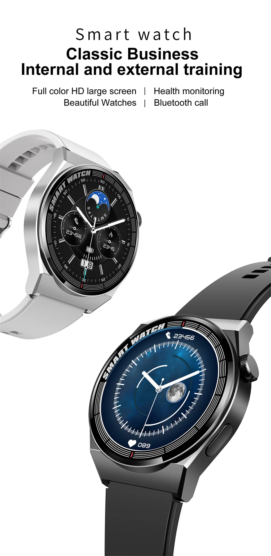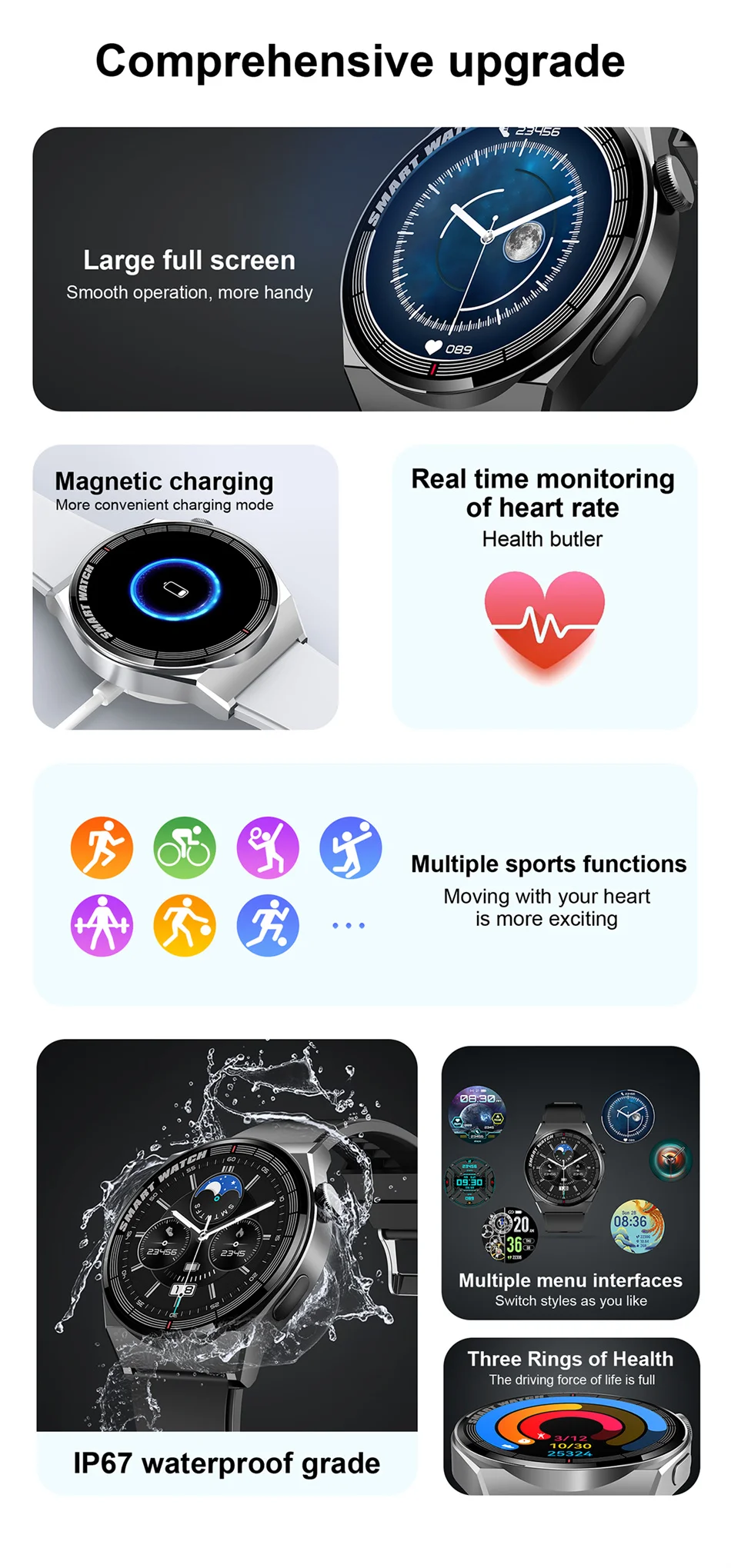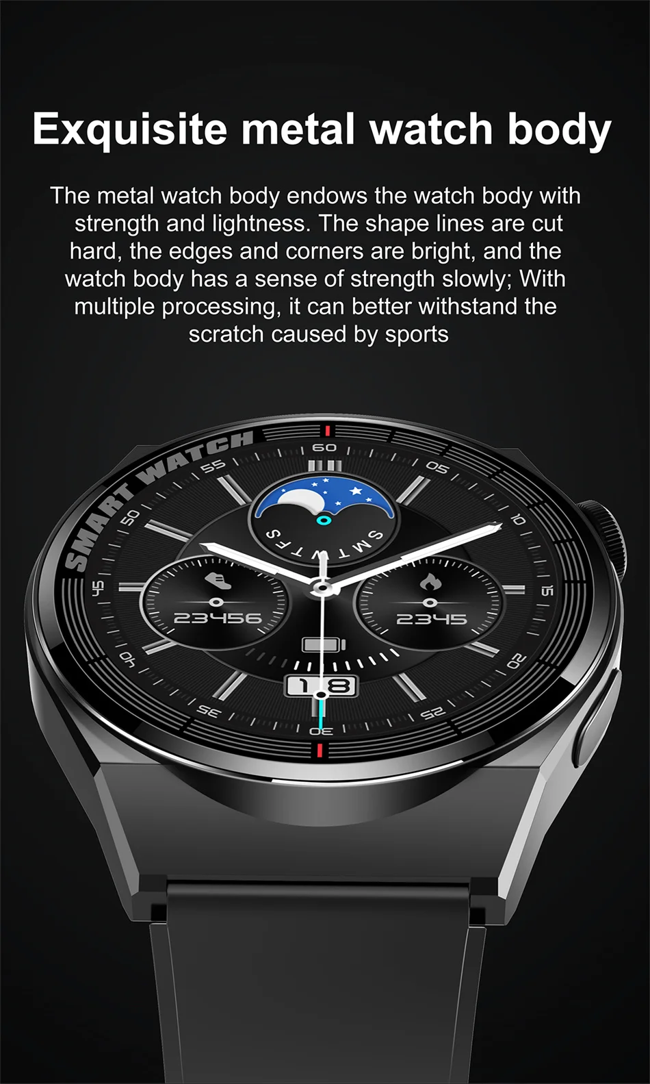 Function:Passometer,fitness tracker,sleep tracker,Message Reminder,Call Reminder,Answer Call,Dial Call,REMOTE CONTROL,Push Message,Altitude Meter,Big Three Needles,24 hour instruction,Chronograph,Alarm Clock,World Time,Permanent Calendar,Month,Heart Rate Tracker,Interactive Music,Noctilucent,Calendar,Countdown,Calculators,Oxymeter