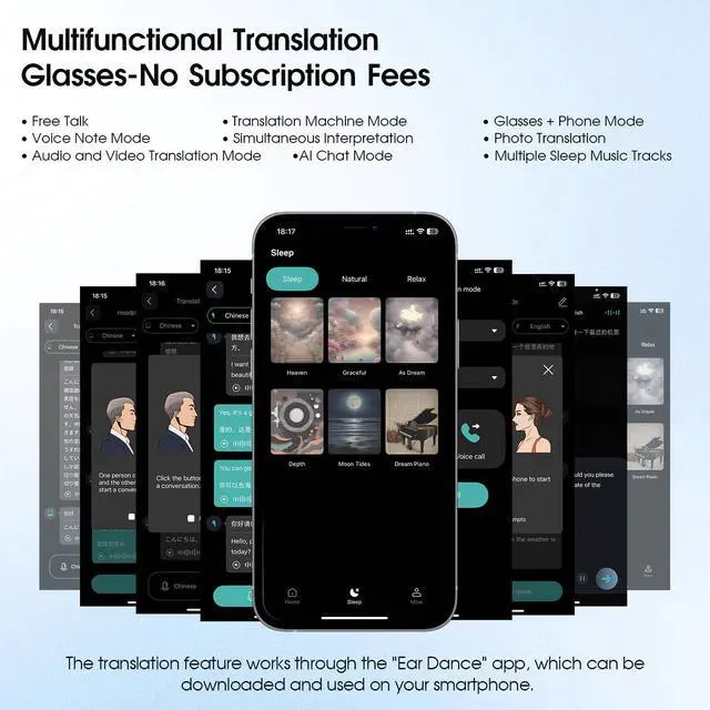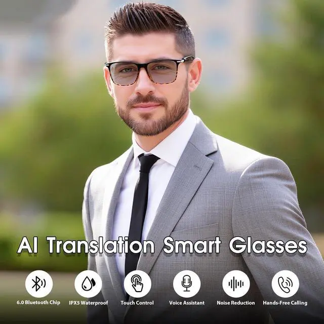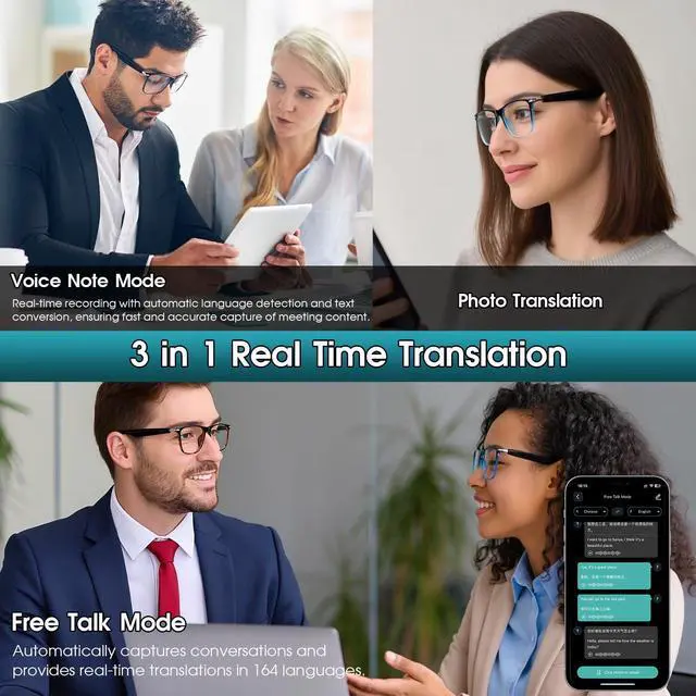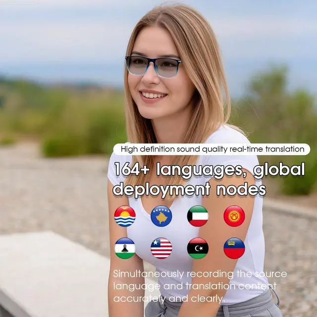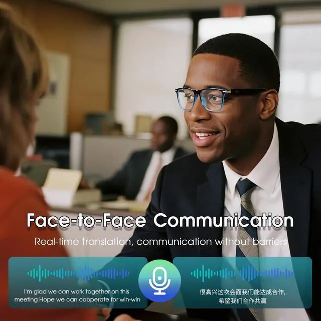 Pair the glasses with your smartphone to capture voice input through the mic. Translations appear instantly on your phone screen, with audio playback from either device.