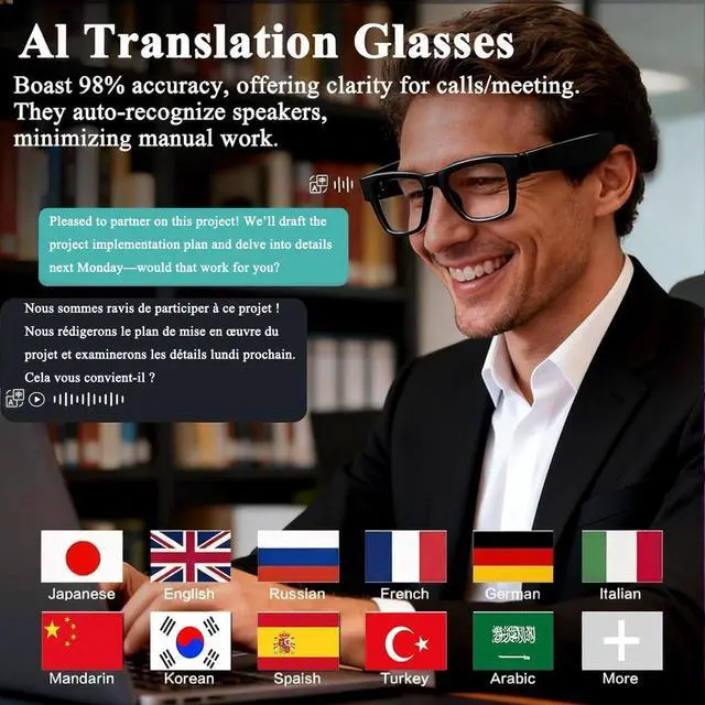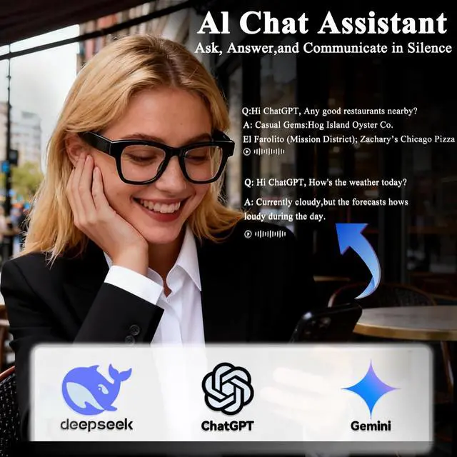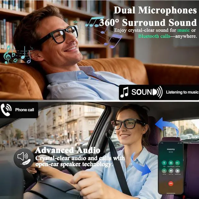 Immersive Audio & Hands-Free CallingOur AI smart glasses feature a dual-speaker configuration that delivers 360° surround sound, sending immersive audio straight to your ears. Enjoy crystal-clear hands-free calls and a rich, captivating music experience with every wear.