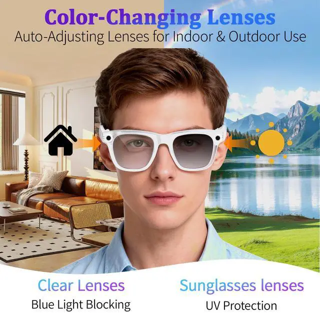 UV & Blue Light Protection Adaptive color-changing lenses for indoor and outdoor use, shielding eyes from UV rays and blue light, ideal for office, travel, and outdoor sports.