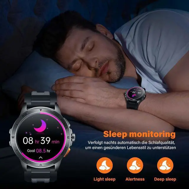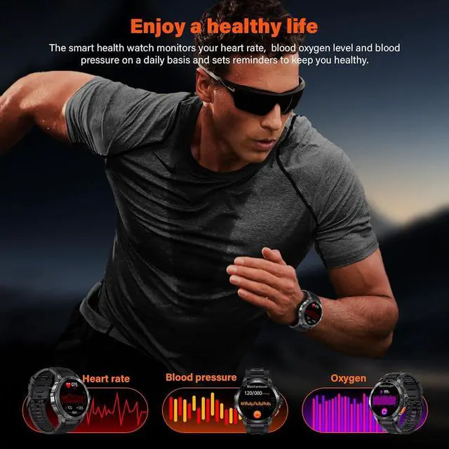 Military smart watch 1.43" AMOLED display: Bluetooth calling function & notifications, With a high-fidelity speaker and integrated microphone, you can answer calls directly via the men's fitness watch. Sync SMS, WhatsApp, Facebook, and other apps never miss any important information.