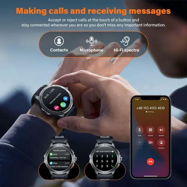 Military smart watch 1.43" AMOLED display: Bluetooth calling function & notifications, With a high-fidelity speaker and integrated microphone, you can answer calls directly via the fitness watch. Sync SMS, WhatsApp, Facebook, and other apps .