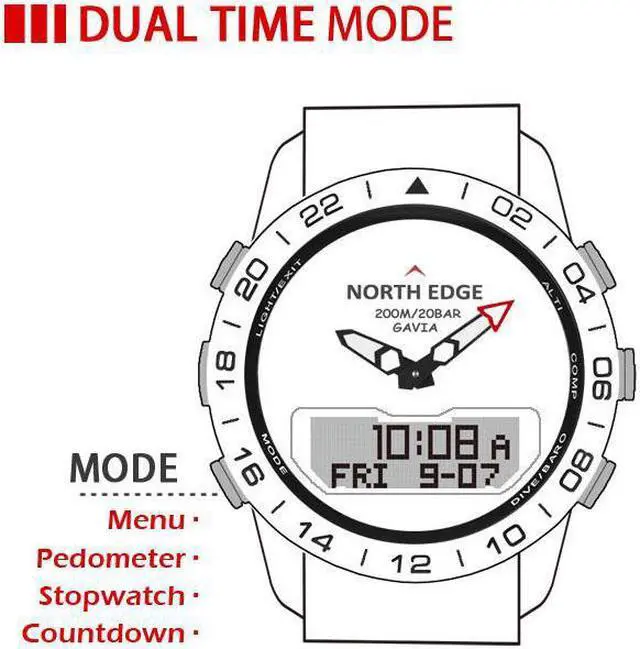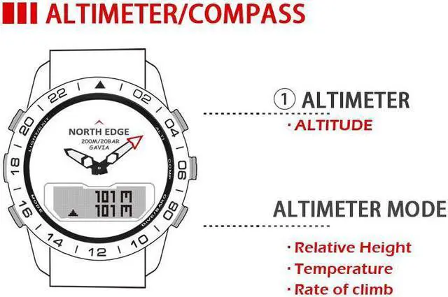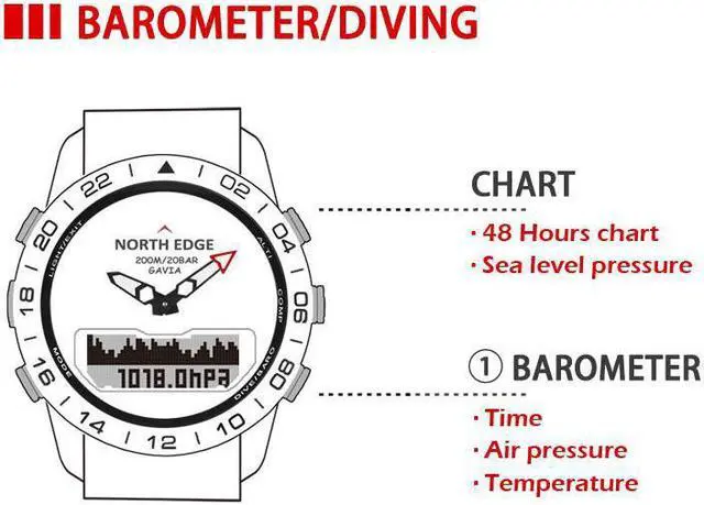 Product is a versatile multi-function watch with altimeter, barometer, electronic compass, pedometer, thermometer, log record, clock, calendar,stopwatch and diving.North Edge new digital watches sport,Watch Men 200M waterproof,design for outdoor sports,young people.