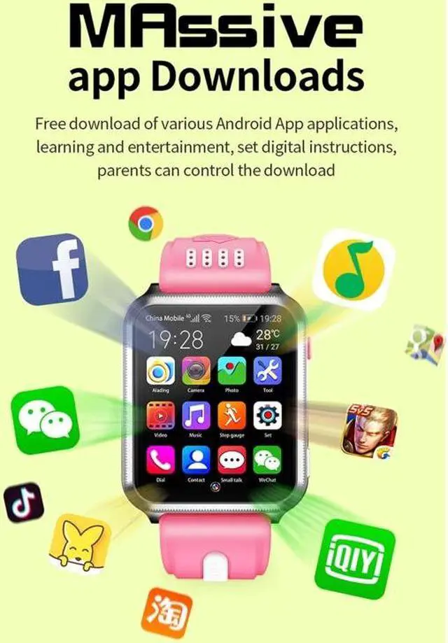 11. Support MP3 function, recording function, video recording function, alarm clock, real-time step counting, electronic fence, real-time trajectory, tracking and positioning, voice intercom, real-time monitoring, forbidden calls from strangers, class schedule, weather forecast, AI voice robot, etc.