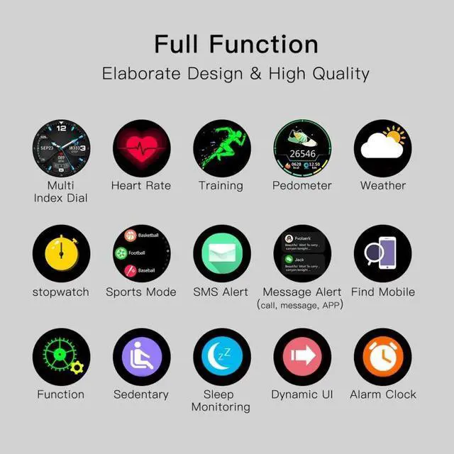 6. Functions: call reminder push, SMS reminder push, WeChat reminder push, QQ reminder push, exercise record (step counting, mileage, etc.), sleep monitoring, sedentary reminder, calorie calculation, stopwatch, dynamic heart rate, blood pressure, vibration, exercise Mode, remote camera, music control, smart alarm, weather forecast, multi-dial switching, WeChat exercise, female menstrual cycle, etc.