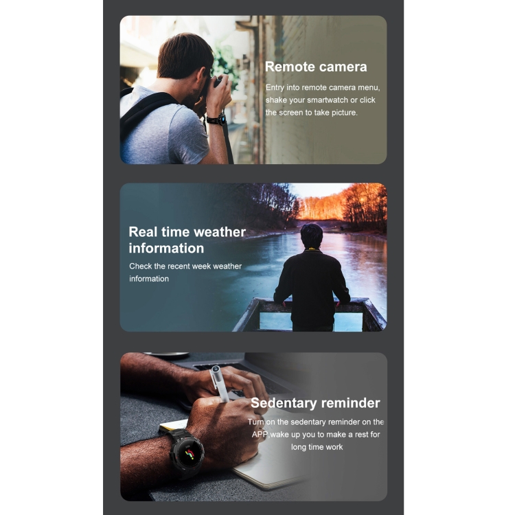 9. Functions: heart rate detection, blood pressure detection, blood oxygen detection, Bluetooth call, Bluetooth music, pedometer, calories, distance, stopwatch, multi-sports mode, female menstrual cycle reminder, incoming call notification, message reminder, alarm clock reminder, remote camera, sedentary reminder to wait