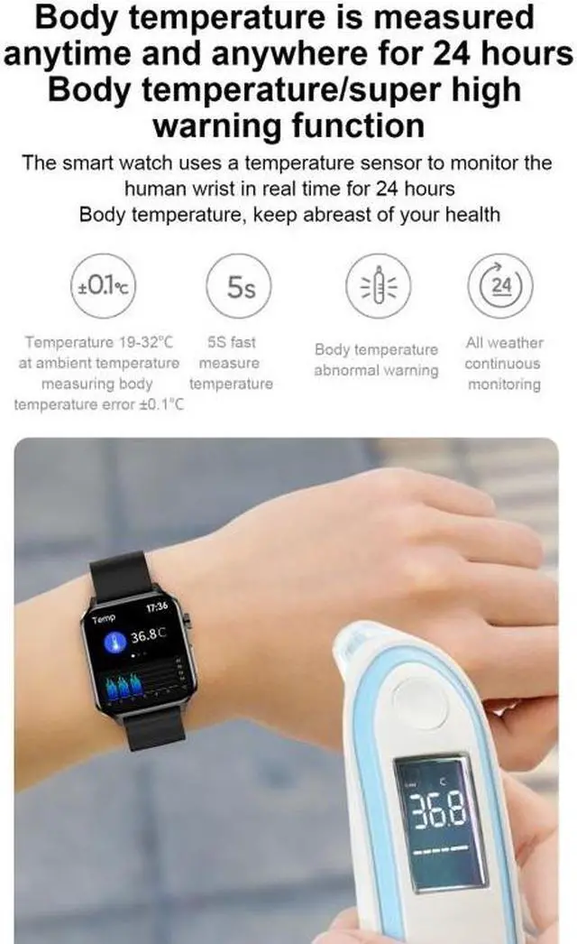 16. Function: Multi-sports mode, heart rate monitoring, blood pressure monitoring, ECG function, AI medical diagnosis, body temperature monitoring, blood oxygen monitoring, breathing rate, remote care of relatives and friends, shake to take pictures, information reminder, music control, stopwatch, step counter Wait