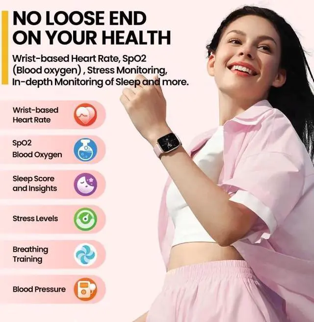 3. Health monitoring: Wrist heart rate (constant, per minute), daily resting heart rate, abnormal heart rate alert, SpO2 (blood oxygen) level measurement, blood pressure, relaxation, cycle tracking, sleep score and insights, calorie burn tracking.