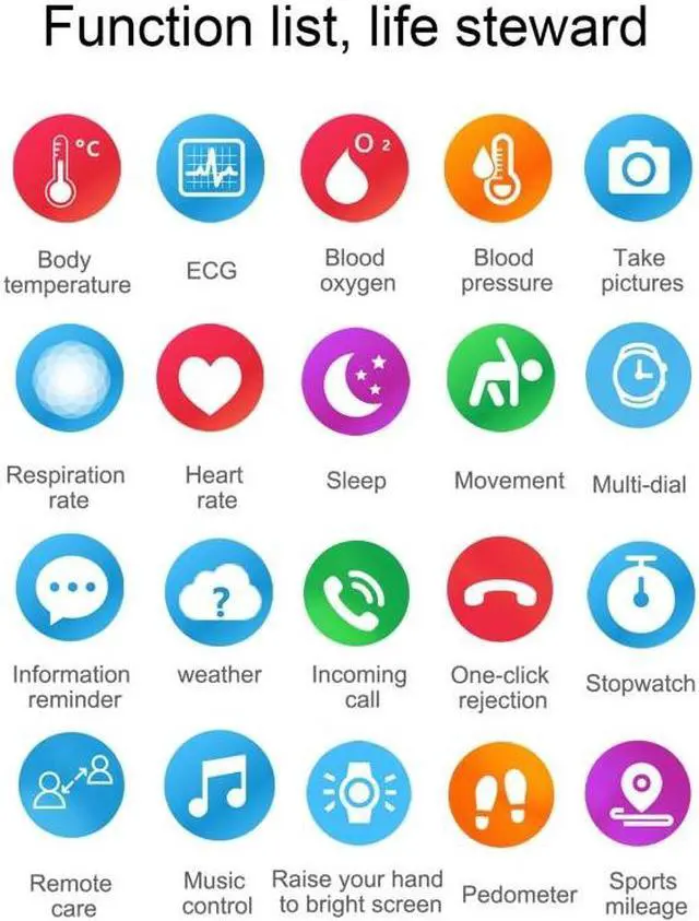 16. Function: Multi-sports mode, heart rate monitoring, blood pressure monitoring, ECG function, AI medical diagnosis, body temperature monitoring, blood oxygen monitoring, breathing rate, remote care of relatives and friends, shake to take pictures, information reminder, music control, stopwatch, step counter Wait