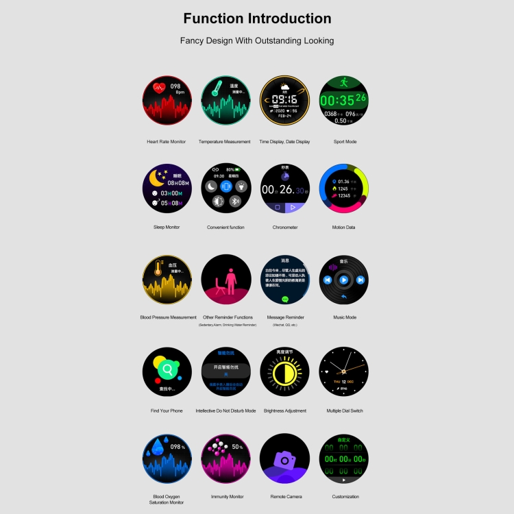 11. Functions: pedometer, calories, sleep monitoring, alarm clock reminder, multi-sports mode, sedentary reminder, call reminder, SMS reminder, remote camera, heart rate monitoring, blood oxygen monitoring, body temperature monitoring, etc.