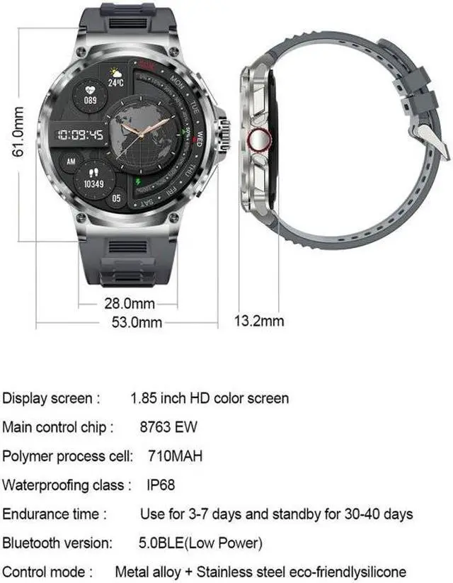 6. Features: Call reminder push, SMS reminder push, WeChat reminder push, QQ reminder push, exercise record (step counting, mileage, etc.., trajectory map, sleep monitoring, sedentary reminder, calorie calculation, stopwatch, low battery reminder, hand up to light screen, fast charging, ultra-low power consumption, heart rate, blood pressure, vibration, sports mode, remote photography, music control, intelligent alarm, weather forecast, HD large screen, multi-dial switching, WeChat sports. call