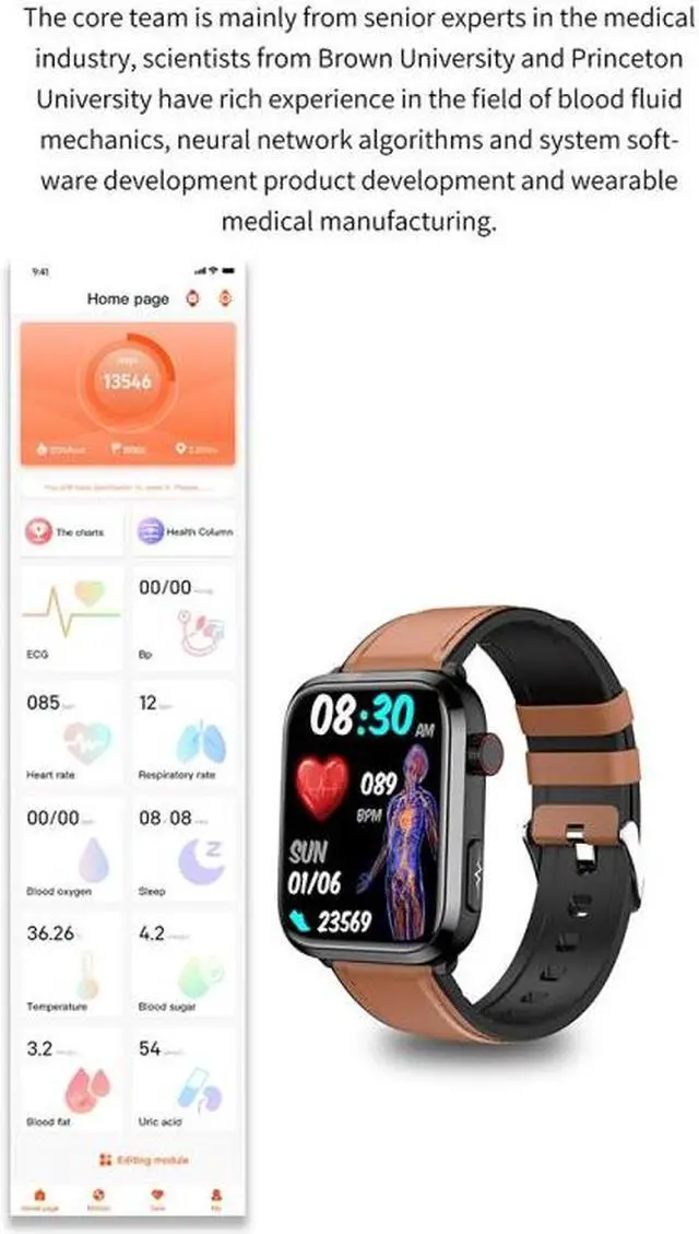 1. Functions: ECG electrocardiogram function, Bluetooth call, non-invasive blood glucose measurement, uric acid measurement, blood lipid monitoring, HRV-AI medical diagnosis, SOS emergency call function, body temperature monitoring, blood oxygen monitoring, breathing training, heart rate monitoring, blood pressure monitoring, sleep monitoring, sedentary reminder and other health functions, intelligent voice assistant, remote relatives and friends care function, women health, weather forecast, step/calorie/distance, multi-sport mode, music control, business card, calculator, calendar, multi-language.