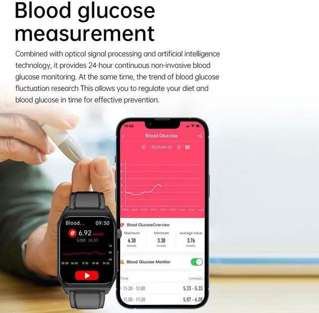1. Functions: Support ECG (high frequency 512HZ) monitoring, HRV and heart health index analysis, ECG belt monitoring, real-time ECG analysis of chest stickers, non-invasive blood sugar, body temperature monitoring, blood oxygen monitoring, Lorenz scatter diagram, heart rate Monitoring, blood pressure monitoring, multi-sport mode, custom dial, online multi-dial, exercise record. Sleep monitoring, incoming call and message reminder, ultra-low power consumption and long battery life. Metal alloy casing, silent alarm clock, remote camera, music control, sedentary reminder, drink water reminder, weather display, countdown, shake to take pictures, mobile phone search.
