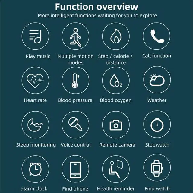 1. Support APP synchronization, answering calls, touch to reject calls, touch to start voice assistant, information push, heart rate, blood pressure, blood oxygen, multi-sport mode, continuous heart rate, search mobile phone, message reminder, message storage, time synchronization, Music playback, remote control camera, drinking water monitoring, sedentary monitoring, sleep monitoring, pedometer, search bracelet, alarm clock setting, stopwatch, screen brightness setting, dial setting, raise hand to brighten the screen, earphone prompt sound