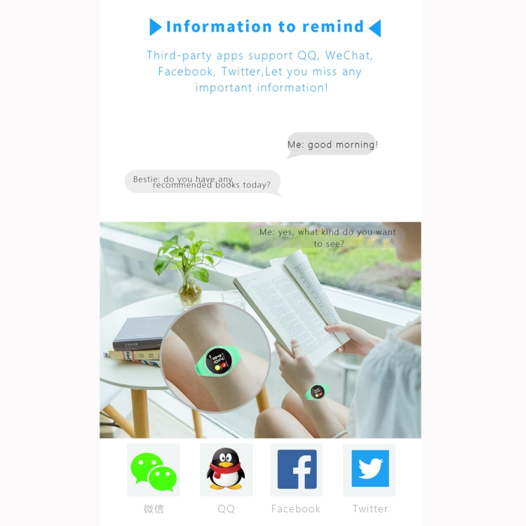 8. Functions: Step-counting, Ranging, Stopwatch, Calorie Consumption Management, Sleep Management, Time Display, Call Reminder, Sitting Reminder, Smart Alarm Clock, Lighting Screen, Smart Remote Photo (Swing or Key), Two-way Search: (Find Cell Phone, Find Handring), Word Bank Display (Wechat, QQ, SMS, Facebook, Twitter), Event Reminder, Social Communication