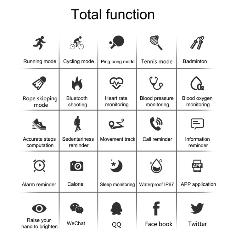 1. Running mode, cycling mode, table tennis mode, tennis mode, skipping mode, badminton, calories, heart rate monitoring, blood pressure monitoring, blood oxygen monitoring, step count, sedentary reminder, motion track, call reminder, message reminder, Alarm reminder, Bluetooth photo, sleep monitoring, APP application, hand-up bright screen, WeChat QQ Facebook, Twitter, etc.