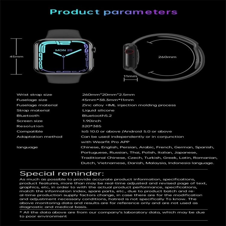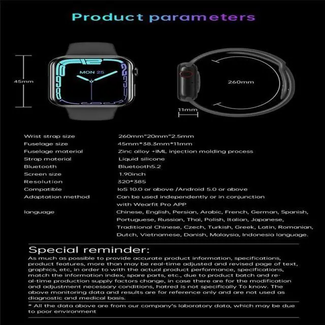 8.Bracelet language:Simplified Chinese, English, Persian, Arabic, French, German, Spanish, Portuguese, Russian, Thai, polish, Italian, Japanese, traditional Chinese, Czech, soil its language, Greek, Latin, romanian, Dutch, Vietnamese, and the Danish, Malaysia, Indonesia language.