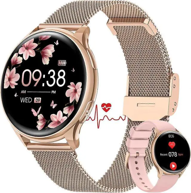Design & Comfort**: Features a lightweight 1.27 -inch round screen and stylish metal case, with rose gold Milanese and pink silicone straps for versatile daily wear.