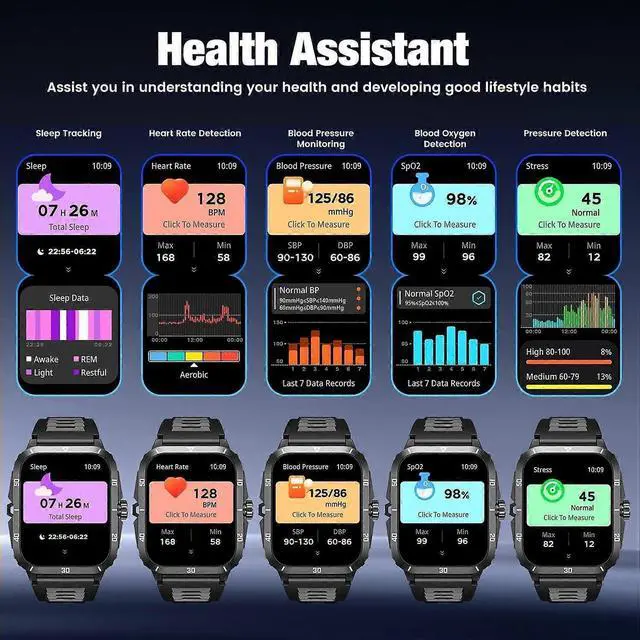 Monitor heart rate, blood pressure, oxygen levels, stress, and sleep quality with 24/7 health tracking.